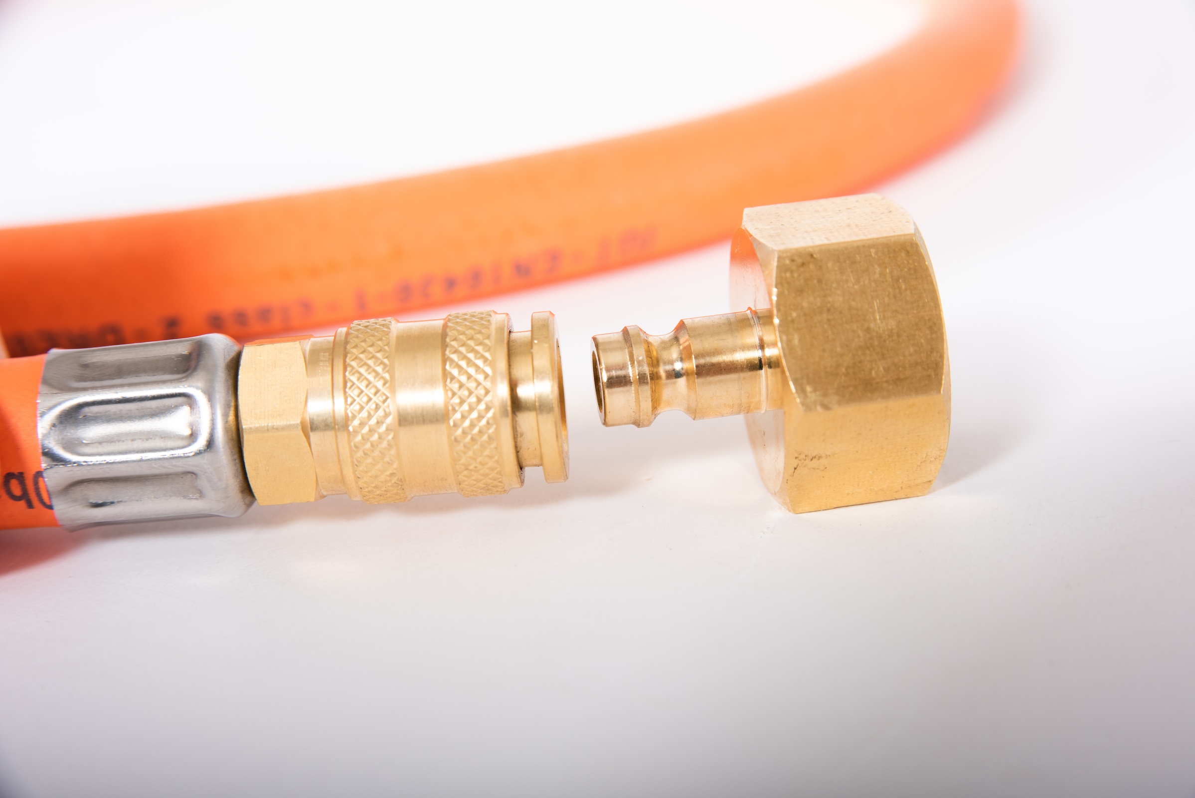 - 1 1/2-Zoll-Schnellkupplung für die Verwendung mit Gas zertifiziert. Das Innenteil ist in das Rohr des Druckreglers integriert und das Außenteil zur Montage an der Gasrampe