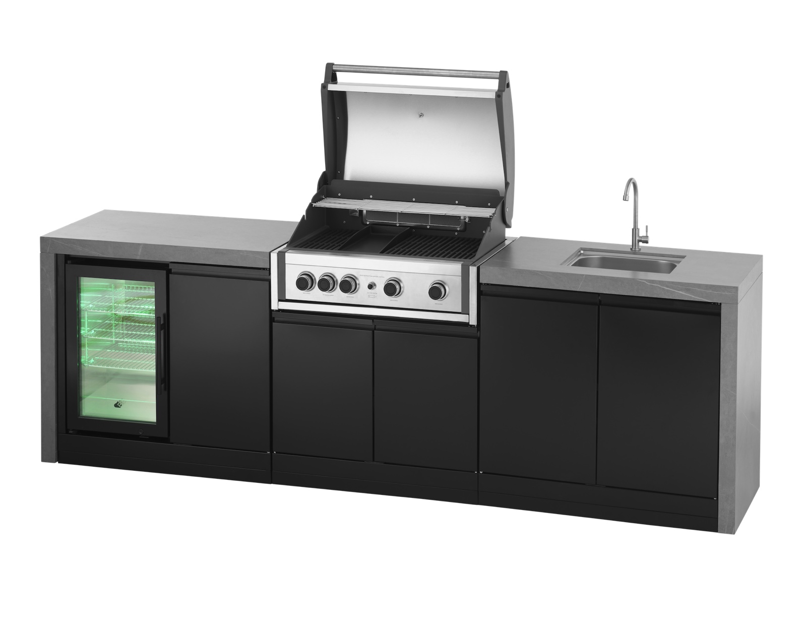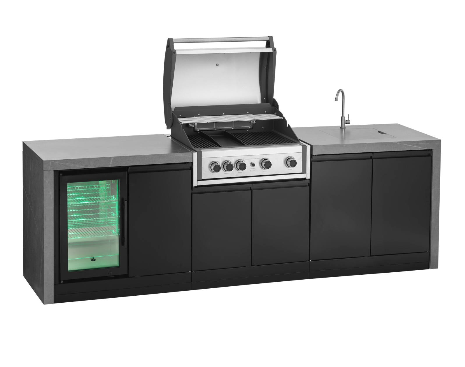 Die Waterfall Outdoor-Küche ist die ultimative Verbindung von modernem Design und erstklassiger Qualität. Sie verfügt über zwei geräumige 90 cm breite Schränke und ist nicht nur mit einer hochwertigen Arbeitsplatte aus Sinterstein ausgestattet, sondern auch mit Seitenwänden aus Sinterstein, wodurch ein nahtloser Wasserfall-Look entsteht, der Eleganz ausstrahlt. Ausgestattet mit einem Outdoor-Kühlschrank und einem Spülbecken mit Wasserhahn lässt diese Outdoorküche kaum noch Wünsche offen.