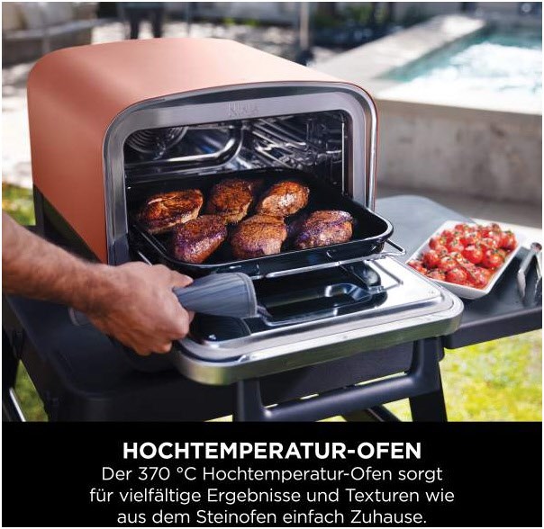 Mit dem Ninja Woodfire Outdoor Ofen, Pizzaofen & Smoker wird das Outdoor Cooking neu gedacht. Der elektrisch betriebene Ofen bietet 8-in-1-Vielseitigkeit mit einem weiten Temperaturbereich von 40-370 °C und bietet auf Knopfdruck eine Welt von Aromen, Texturen und Ergebnissen.