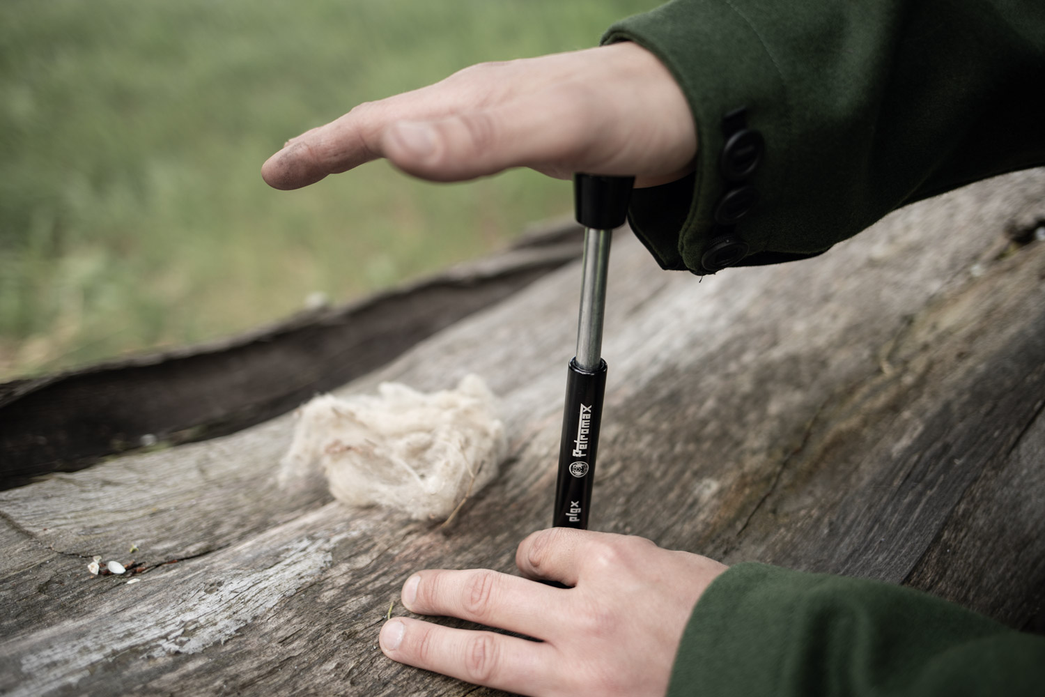 Die traditionelle Art, Zunder in einem Hohlzylinder durch Luftdruckkompression zu entzünden, war bereits Urvölkern bekannt. Diese Technik wird in Form des Petromax Feuer Kolbens wiederbelebt und ist so denkbar einfach wie effektiv: Der Kolbenkopf wird mit Zunder bestückt und dann schlagartig in die Kolbenhülse gepresst. Durch den entstehenden Luftdruck und die sich dabei entwickelnde Hitze von bis zu 400 °C entzünden Sie den Zunder und damit ein bereitgelegtes Glutnest oder eine vorbereitete Feuerstelle – ganz ohne Strom, Anzünder oder weitere Hilfsmittel. Als zusätzliche Zündalternative finden Sie einen im Kolbeninneren verstauten Stab-Feuerstahl, der einen funkenfliegenden Feuerstart garantiert.