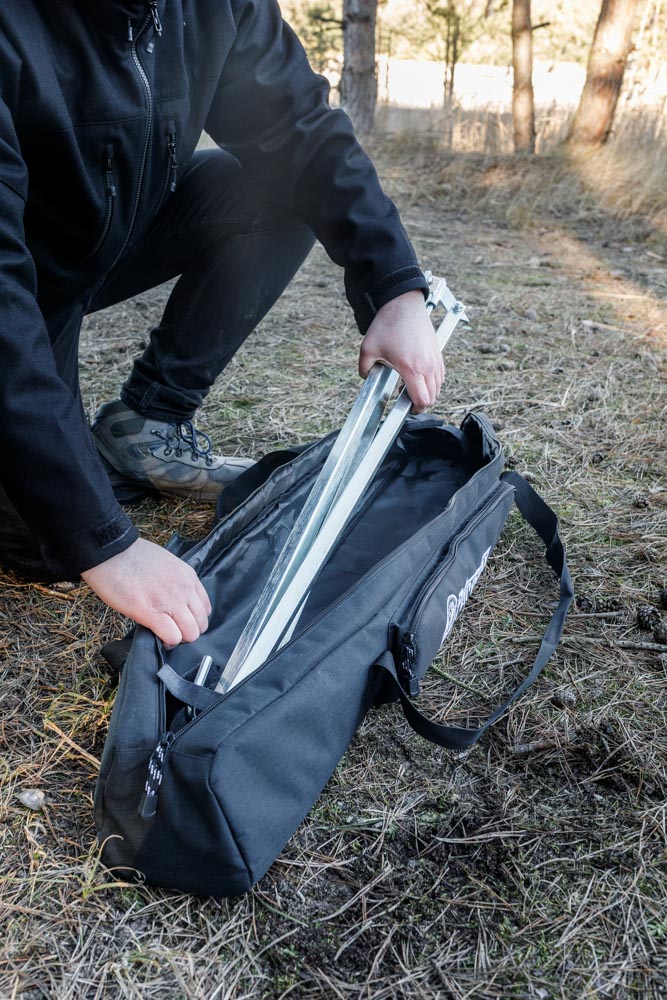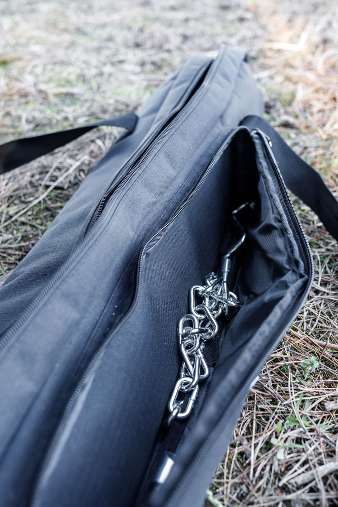 Dank des robusten Ripstop-Gewebe, dem verstärkte Boden und der Klett-Fixierung ist das Dreibein mit seinen spitz zulaufenden Füßen in der Tasche sicher verstaut. So können sie es an den mit Leder verstärkten Tragegriffen bequem über der Schulter tragen. Zubehör wie Kette und Haken findet in der Außentasche reichlich Platz.