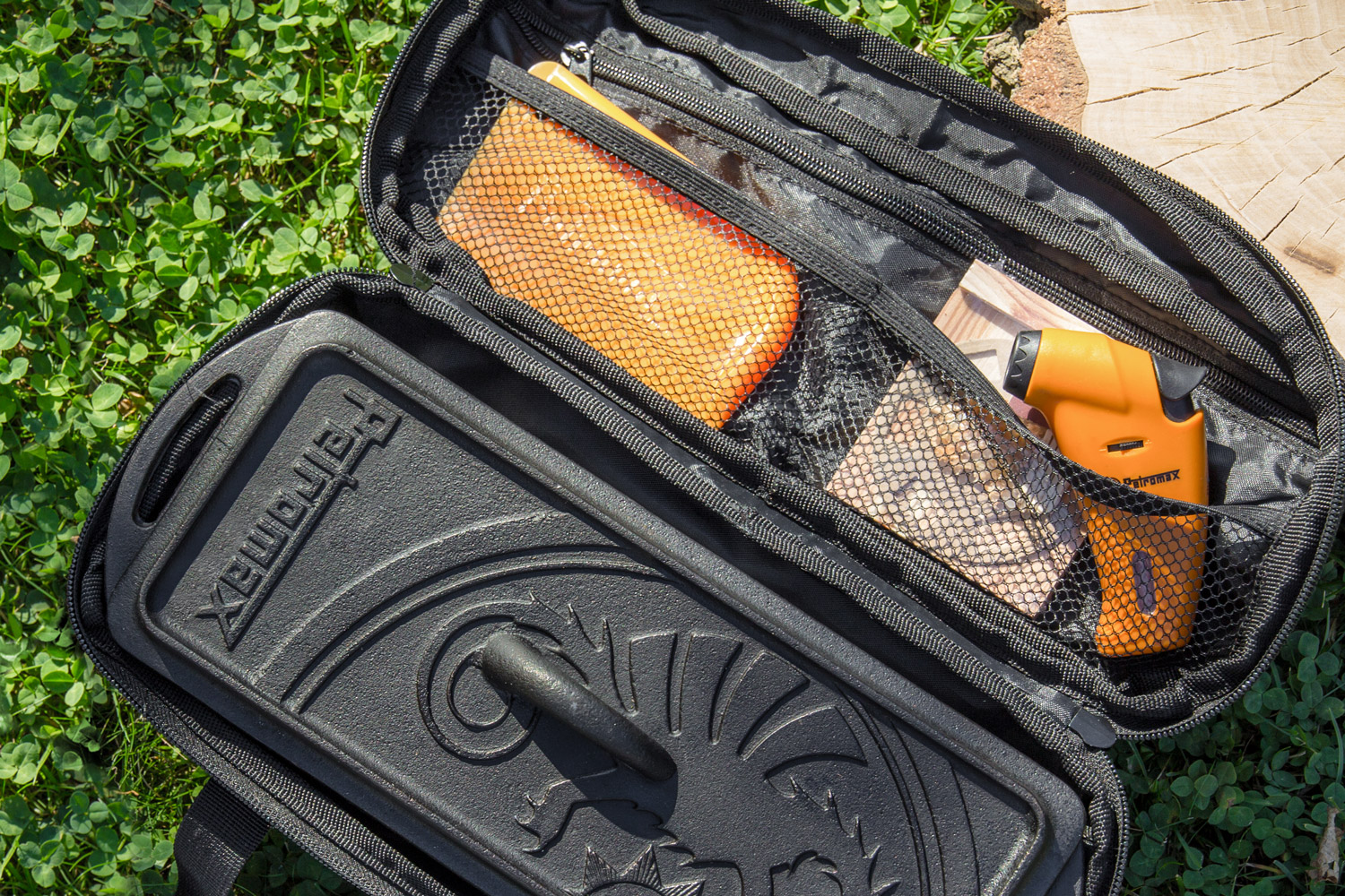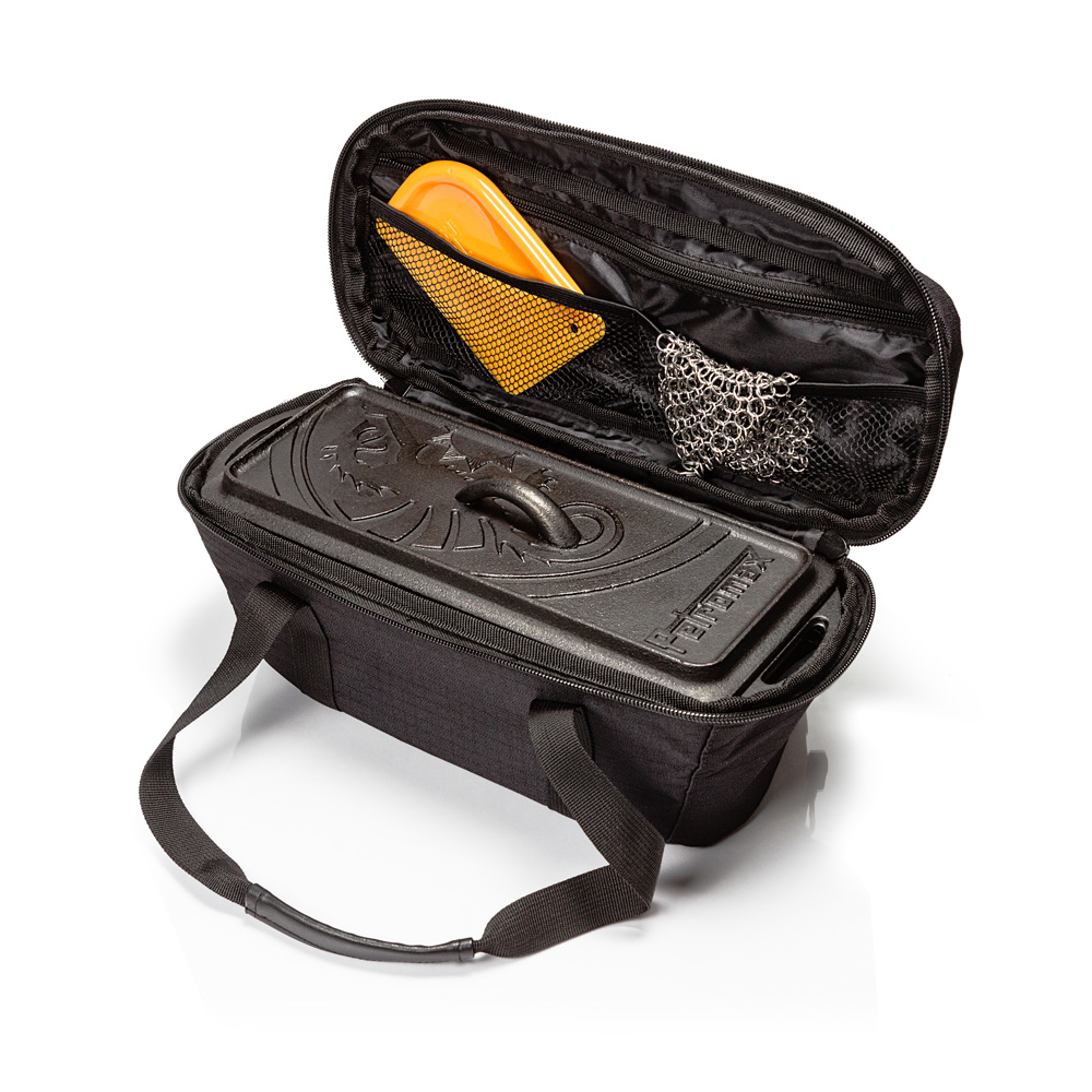 Durch den dreiseitigen Reißverschluss entsteht eine große Öffnung, sodass sich die Kastenform einfach in der Tasche verstauen und auch wieder herausnehmen lässt. Innen im Taschendeckel findet sich eine zusätzliche Reißverschlusstasche sowie zwei Netzeinschubtaschen. Hier findet kleinteiliges Zubehör Platz. Die Oberseite der Tasche ziert das eingestickte Petromax Drachen-Logo mit Schriftzug.