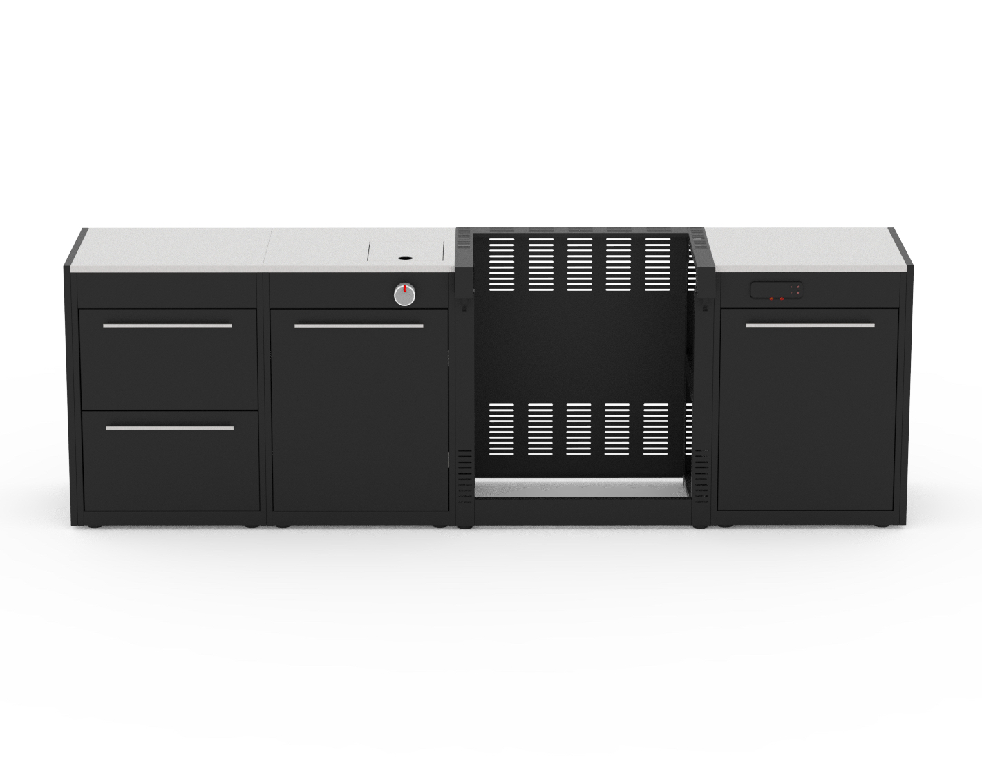 Das langlebige Material ist vollverzinkt und pulverbeschichtet und damit perfekt für den Außenbereich geeignet. Edelstahl-Arbeitsplatten aus gebürstetem Edelstahl sorgen für hygienisches Arbeiten in der Küche und verhindern Rost. Soft-Close-Beschläge von Blum sorgen für Langlebigkeit und eine hohe Stabilität. Der Soft-Close-Mechanismus an Türen und Schubladen verleiht Ihrer Outdoor-Küche einen eleganten Touch und sorgt für sanftes Schließen. Mit den verstellbaren Füßen lässt sich Ihre Küche nivellieren, sodass Sie die Outdoorküche an fast jede Umgebung und auf die für Sie perfekte Höhe anpassen können.