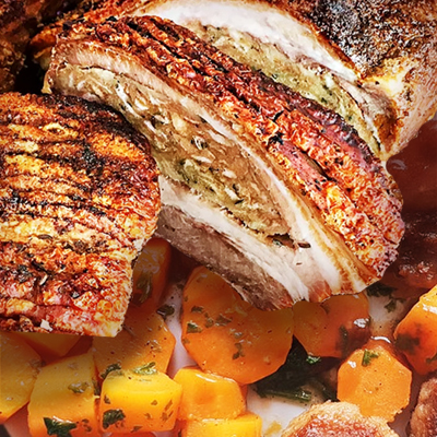 - Gegrillter und gefüllter Schweinebauch mit Karotten-Kartoffelgemüse