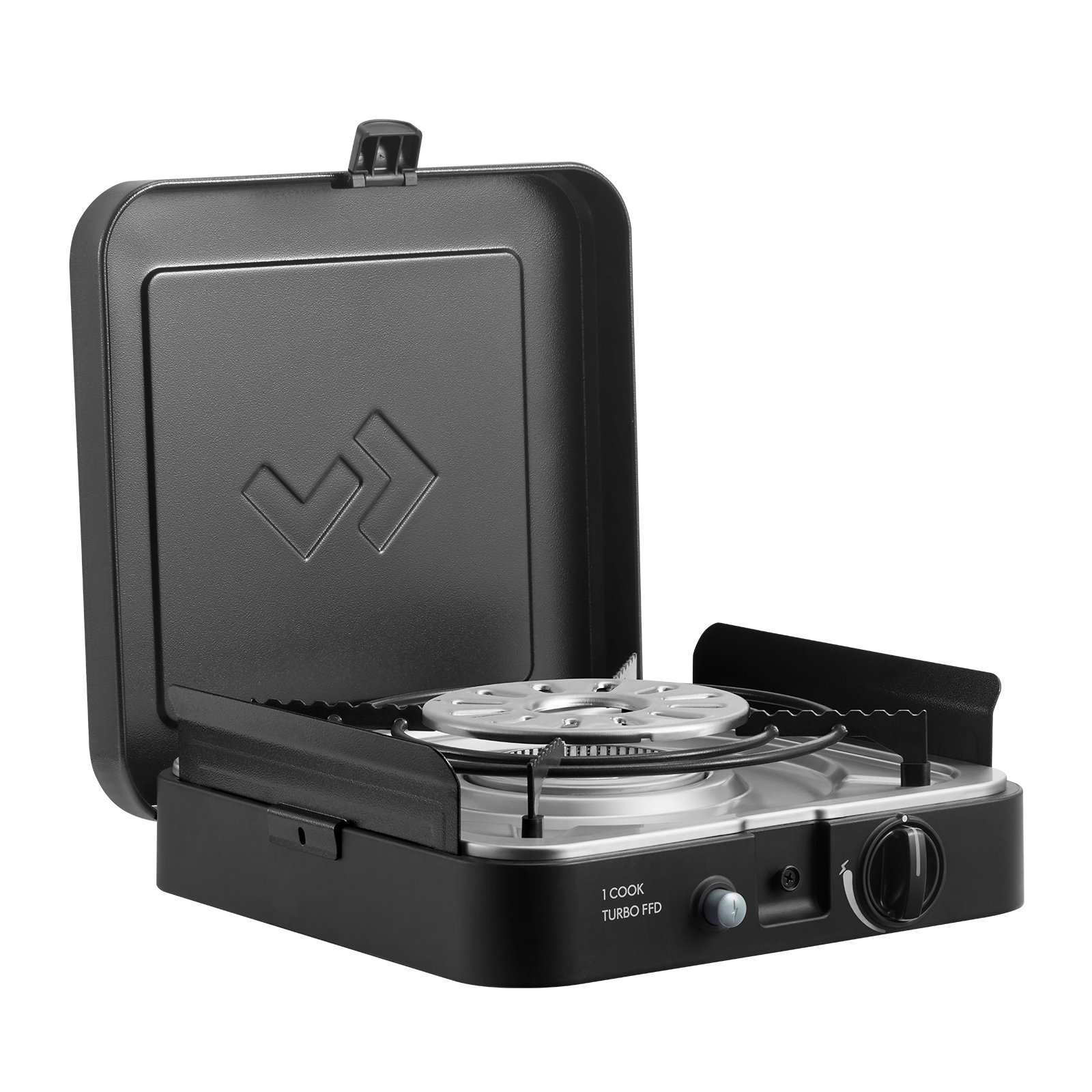 Der Cadac 1-Cook Turbo FFD Camping Gaskocher ist mit einem 2,2 kW Turbo Brenner ausgestattet, der tief im Gerät verbaut und so weniger empfindlich gegenüber Wind ist. Das führt zu einer stärkeren Wärmeabgabe, was die Kochzeit und den Gasverbrauch wesentlich reduzieren kann. Als zusätzlicher Schutz vor Wind dienen die beiden seitlichen, abnehmbaren Windbleche.