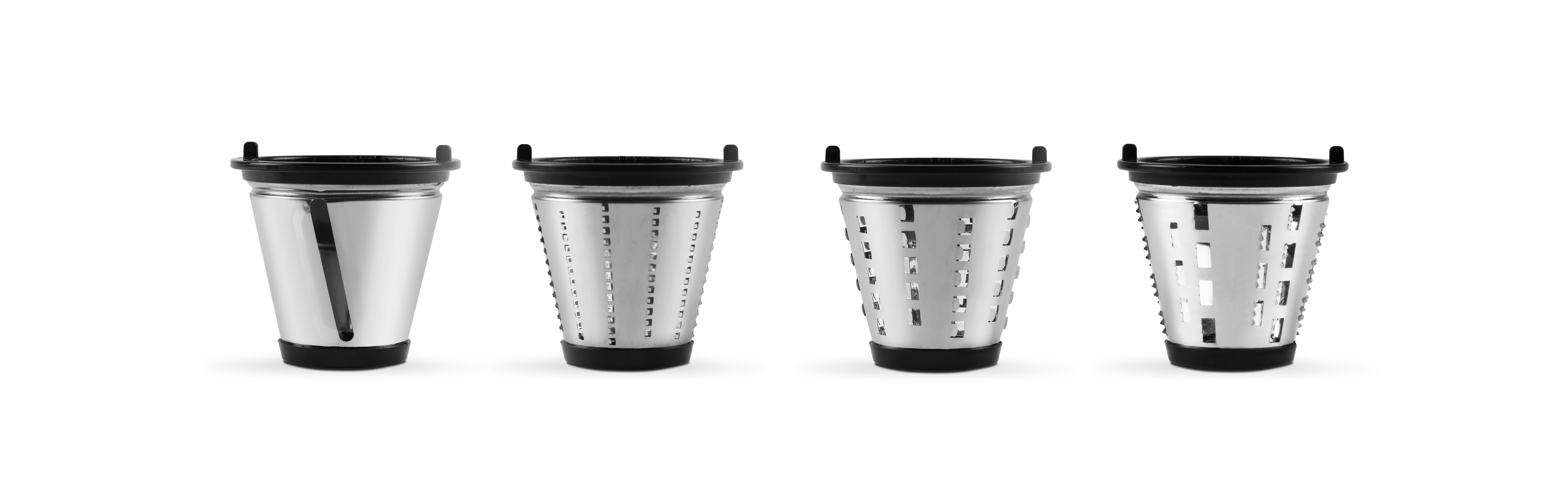 - Konische Form der Einsätze zum leichteren Transportieren des Reibeguts