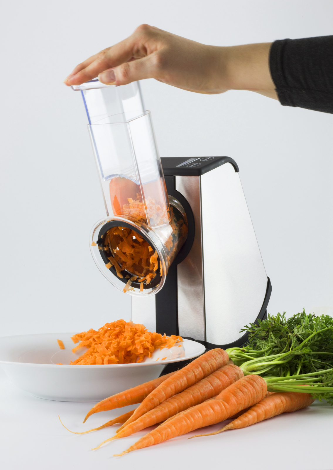 Mit vier auswechselbaren Einsätzen ist die flinke Helferin gut gerüstet für gleichmäßige Scheiben, große oder kleine Julienne und für feinstes Raspeln. Dabei handelt es sich um hochwertige Acid- Etched-Einsätze, deren Klingen extrem scharf zu Werke gehen. Die 200 Watt starke Reibe arbeitet mit sehr stabilem Stand auf fünf Geschwindigkeitsstufen, die über ein modernes Soft-Touch-Bedienfeld eingestellt werden. Geschnitten und gerieben wir direkt in das gewünschte Gefäß. Zum leichteren Transport des Reibeguts ist die CR4 mit konisch geformten Einsätzen ausgestattet und kann in verschiedene Positionen gekippt werden, um einen individuellen Arbeitswinkel einzustellen.