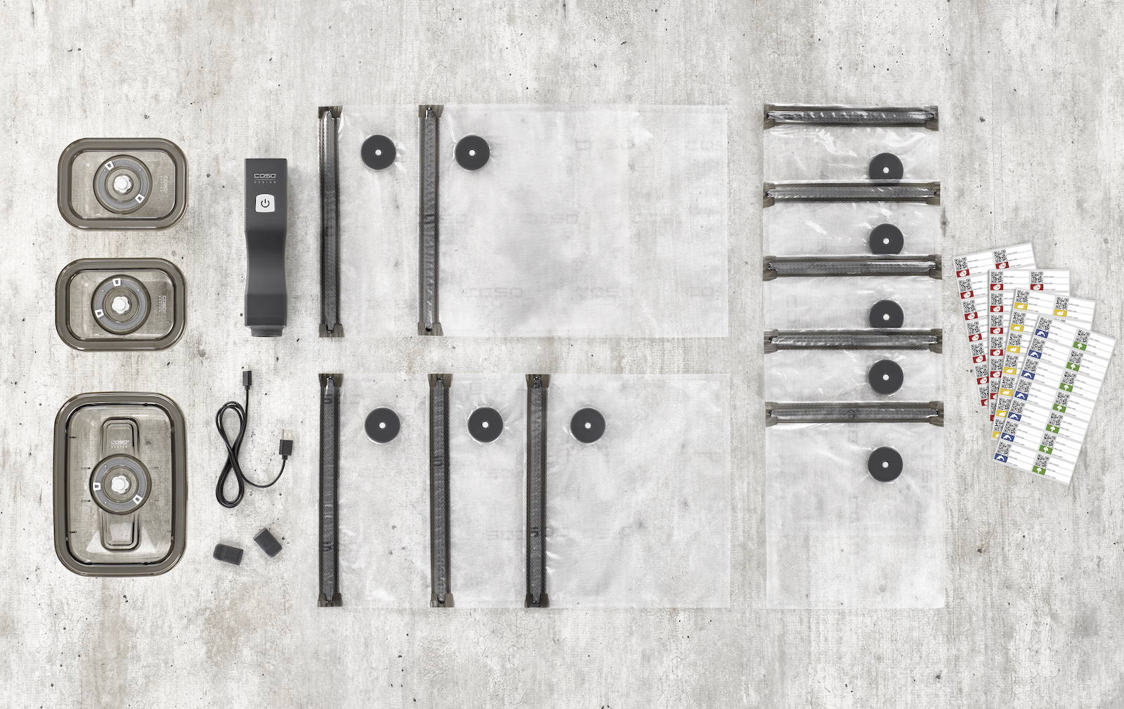 - Inklusive 3 Vakuumbehälter, 2 ZIP-Locker, USB-C Ladekabel und CASO Food Manager Sticker
