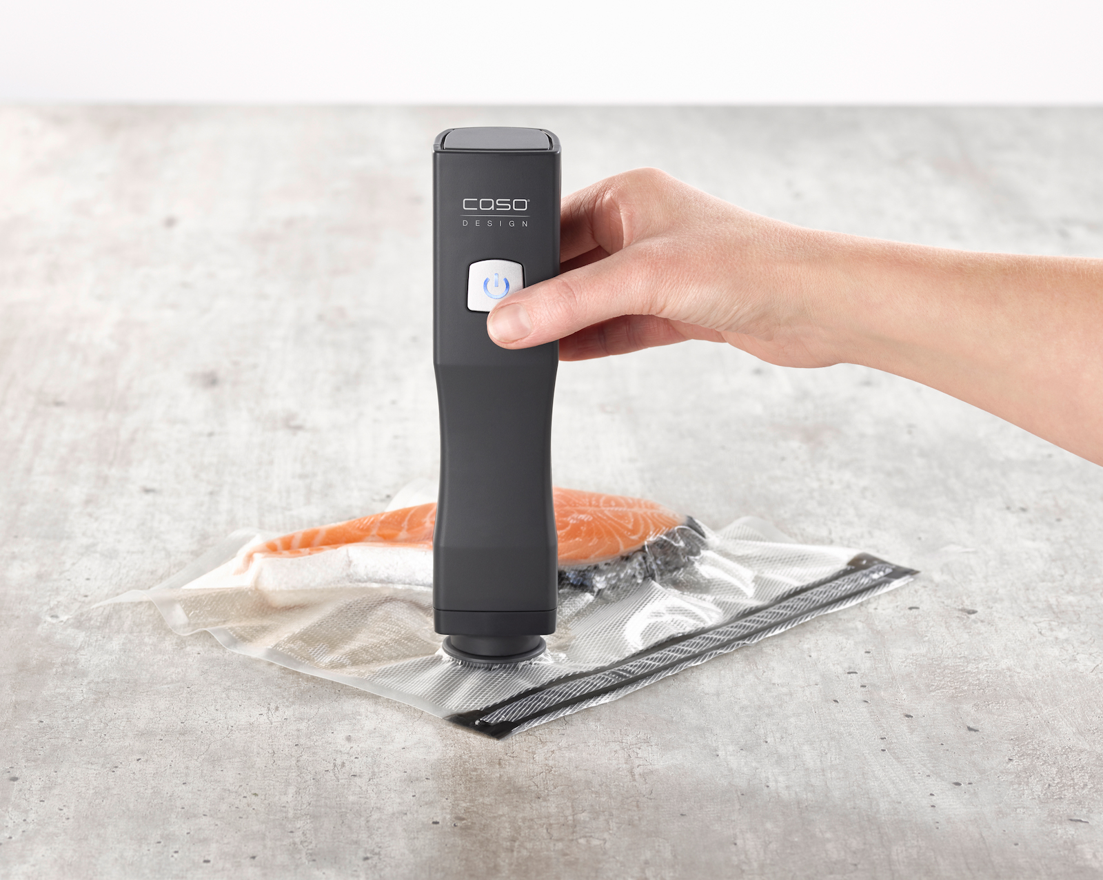 Für mehr Flexibilität im Alltag lassen sich mit dem Handvakuumierer Vacu OneTouch von CASO Design wertvolle Lebensmittel per Ein-Hand-Bedienung ganz einfach und flexibel unter Vakuum frisch halten. Einmal aufgeladen hält der kleine Helfer bis zu 150 Minuten und kann praktisch überall eingesetzt werden.