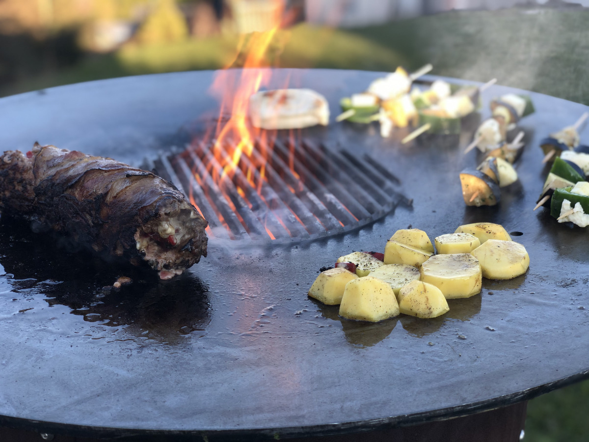 Die Plancha hat einen Durchmesser von 90 cm und ein Feuerloch von 30 cm. Die Grillfläche reicht somit aus um ca. 20 Burger zeitgleich zuzubereiten. Für das Feuerloch ist zusätzlich ein Grillrost aus Gusseisen enthalten. Durch diesen wird die Grillfläche ganz einfach erweitert und dem klassischen Grillgut kann ein schönes Branding verpasst werden. Dies ermöglicht eine Kombination aus indirektem und direktem Grillen. Unzählige Möglichkeiten mit denen Du deine Gäste überraschen kannst warten auf Dich.