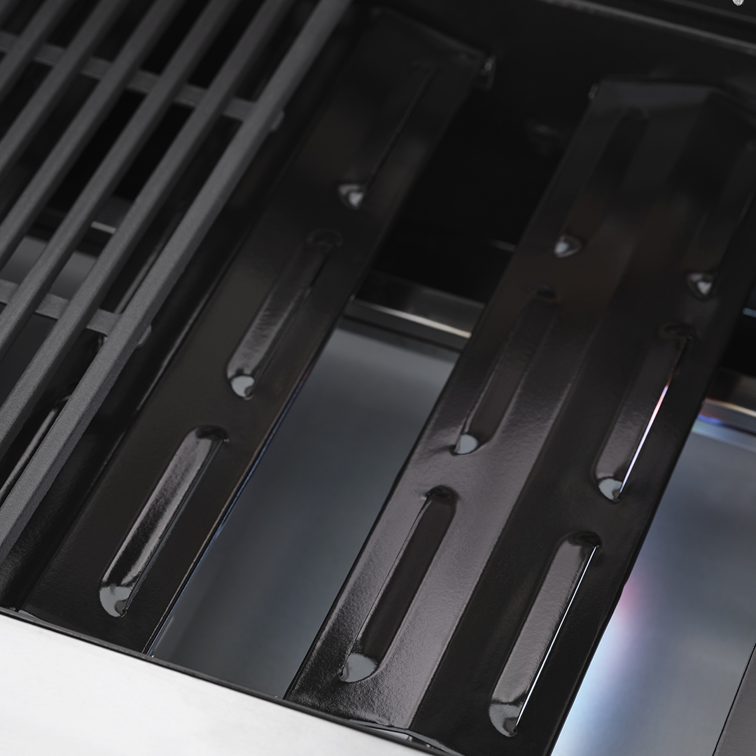 Der Grandpro Maxim G5 Einbau-Gasgrill überzeugt mit einer großzügigen Grillfläche mit 80 x 45 cm und solider Verarbeitung. Freuen Sie sich auf komfortable Handhabung und hervorragende Ausstattung. Dank der gusseisernen Grillroste erreichen Sie eine gleichmäßige Hitzeverteilung und Ihre Steaks, Würstchen etc. erhalten das perfekte Branding. Die Grillfläche besteht aus vier Rosten: einer emaillierten gusseisernen Grillplatte und drei emaillierten gusseisernen Rosten. So können Sie gleichzeitig backen und grillen. Die fünf Hauptbrenner und der Infrarot-Heckbrenner sorgen somit für viel Power auf dem Grill.