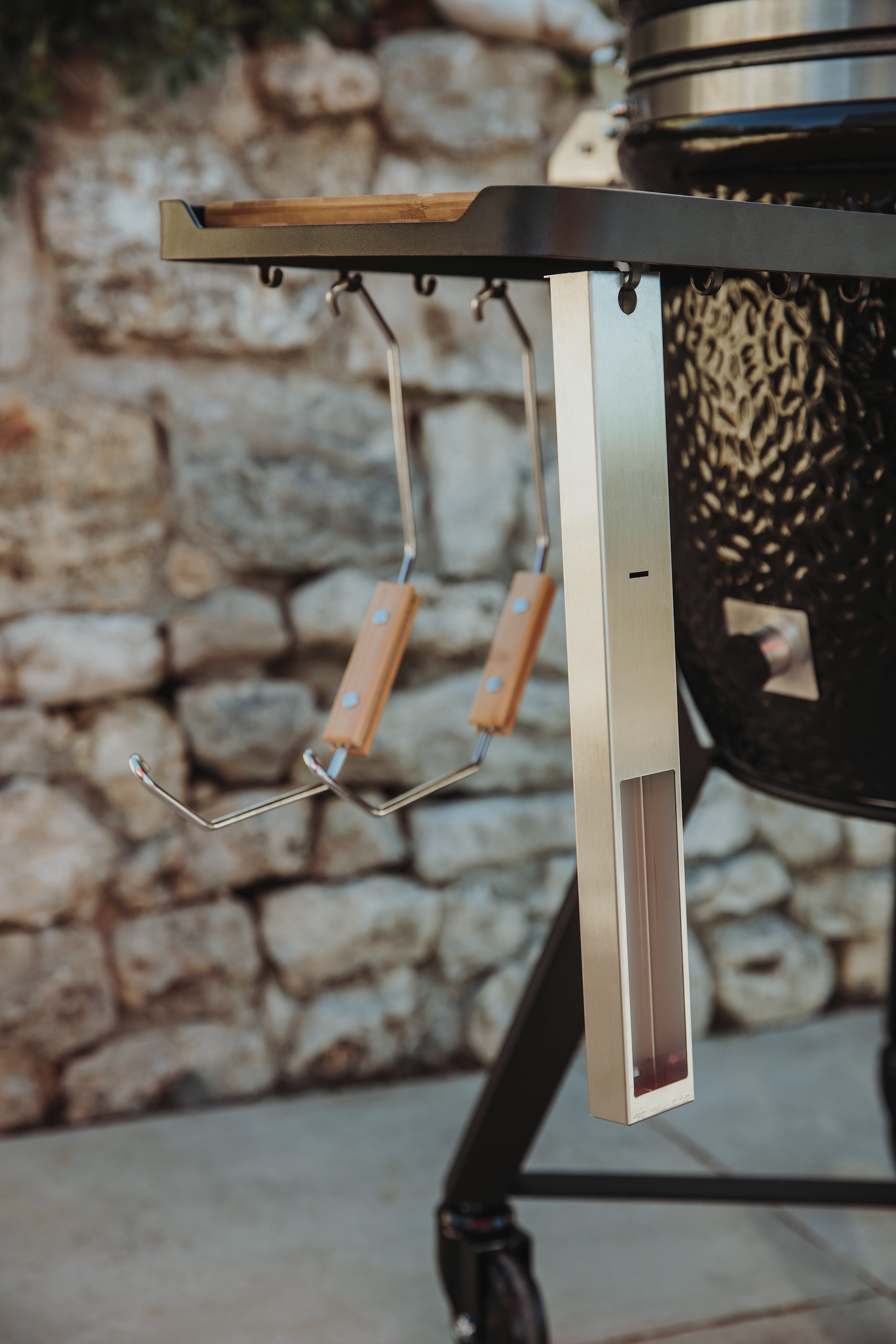 ten Gestell aus pulverbeschichtetem Stahl hebt er sich optisch und funktional deutlich ab. Das neue Gestell vereint Ästhetik und Funktionalität. Es bietet höchste Stabilität, ist witterungsbeständig und dank durchdachter Details wie Ablageflächen mit zahlreichen Haken für Grilltools und leichtgängigen Rollen besonders benutzerfreundlich.