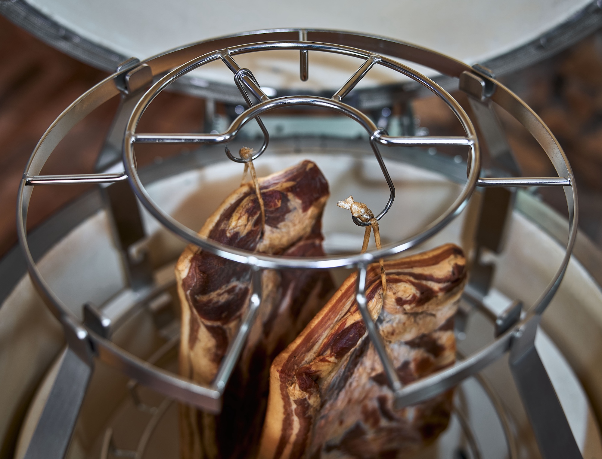 Die Anwendung ist ganz unkompliziert: Das stabile Räuchergestell aus langlebigem Edelstahl wird einfach mit vier Steck-Beinen auf das Monolith SGS-System aufgesetzt und schafft zusätzliche Höhe, um zum Beispiel ganze Forellen, Pastrami, Speck, Würste oder Käse komfortabel aufhängen zu können. Dazu sind bereits 6 stabile Edelstahlhaken im Set enthalten.