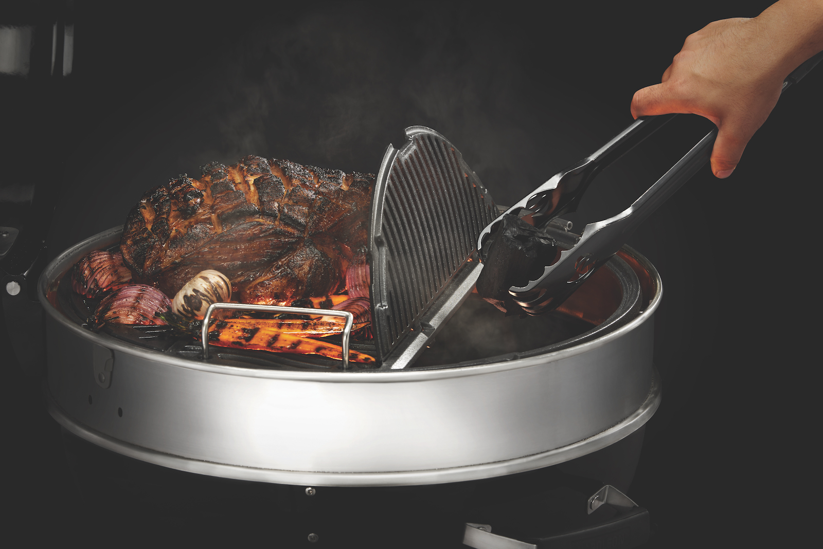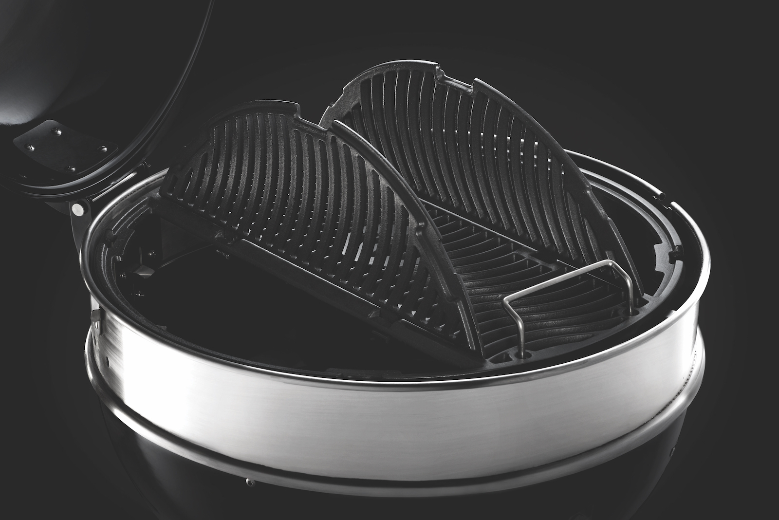 Der Erweiterungsring aus Edelstahl ist für Drehspießgerichte geeignet und verfügt über Türen, die die Öffnungen für den Spieß abdecken. Integrierte Türen für Temperaturfühler sorgen dafür, dass Sie den Garvorgang genau steuern können. Die überaus stabile porzellanbeschichtete Stahlkonstruktion ist gegen Verschleiß gewappnet. Durch den klappbaren Deckel haben Sie Zugriff auf die gesamte Kochfläche.