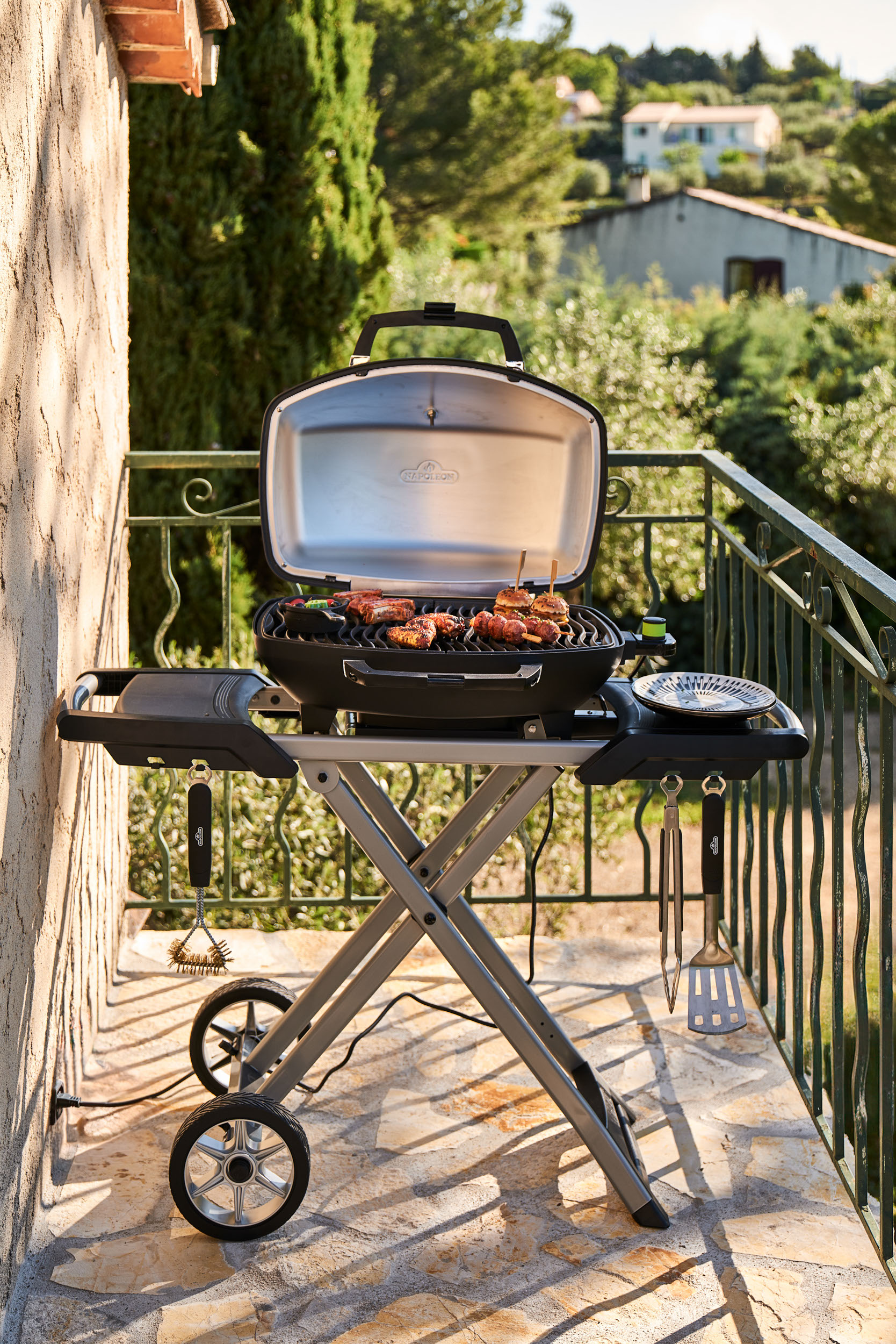 Der PRO285EX ist mit einem Schuko-Anschluss ausgestattet und somit ideal für Gärten und Balkone. Mit seinen einladenden Seitenablagen inklusive Besteck- und Handtuchhalter bietet der solide Wagen Platz für Zubereitung und Zubehör. Mit seinen großen Rädern wird er zum praktischen Grilltransporter und lässt sich mit der Wandaufhängung zusammengeklappt besonders platzsparend verstauen. Dank des neuen hohen Deckels aus Aluminiumdruckguss lassen sich auch große Stücke mühelos zubereiten.