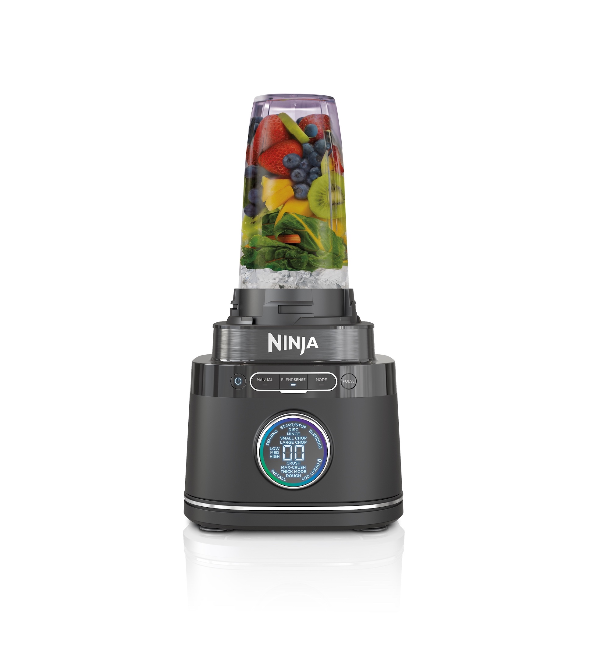 Der Ninja Detect Power Mixer Processor Pro revolutioniert das traditionelle Mixen, indem er Zutaten, Eis und Portionsgröße erkennt und seine Einstellungen mithilfe der BlendSense Technologie anpasst, um perfekte Ergebnisse zu erzielen. Zutaten hinzufügen, den Drehschalter drücken und zusehen, wie der Mixer sie in perfekte Eisgetränke, Smoothies und mehr verwandelt. Dieses vielseitige Küchenwunder vereint die Leistung und Funktionalität eines traditionellen Standmixers, eines persönlichen Smoothie Makers und einer Küchenmaschine in einem Gerät. Müheloses Hacken, Mixen, Zerkleinern und Schneiden auf Knopfdruck.