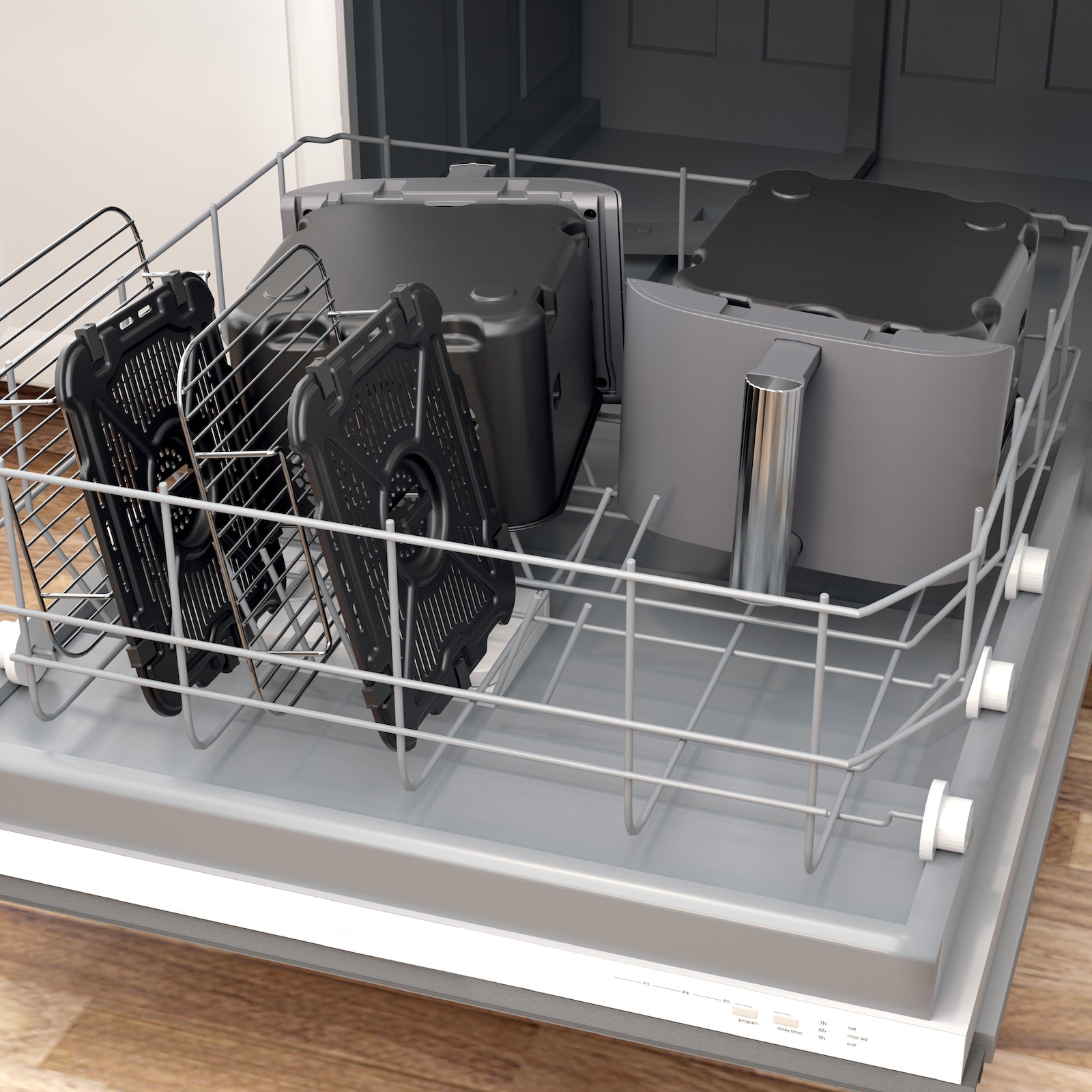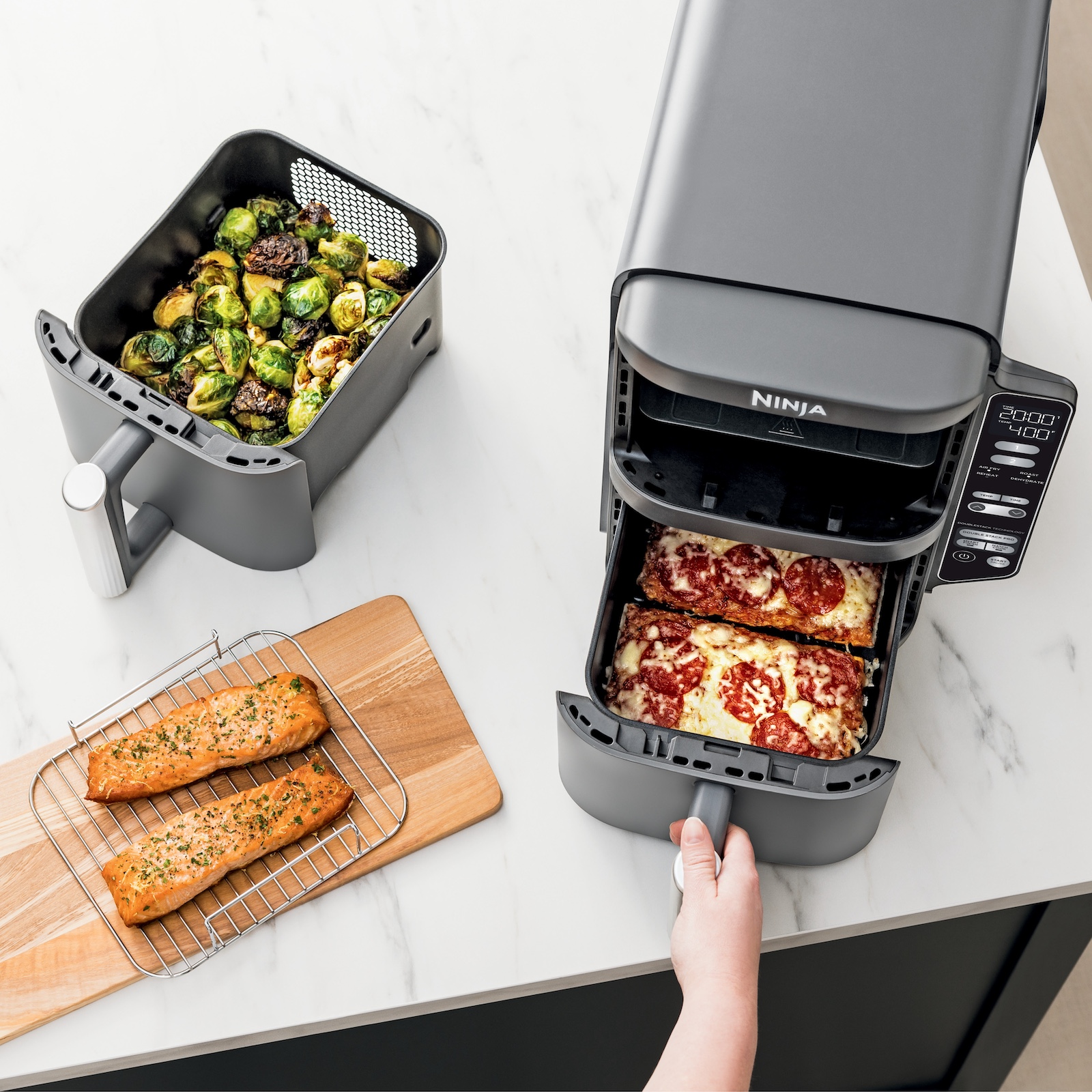 Jede Schublade verfügt über eine eigene Wärmequelle und einen Ventilator auf der Rückseite, der für eine 360°-Luftzirkulation sorgt - für rundum knusprige Ergebnisse. Legen Sie Ihre Speisen auf die Grillroste, um auf mehreren Ebenen zu garen, perfekt für Hähnchenschenkel mit Spargel, Lachsfilets mit Kartoffeln oder Rinderburger mit Pommes Frites.