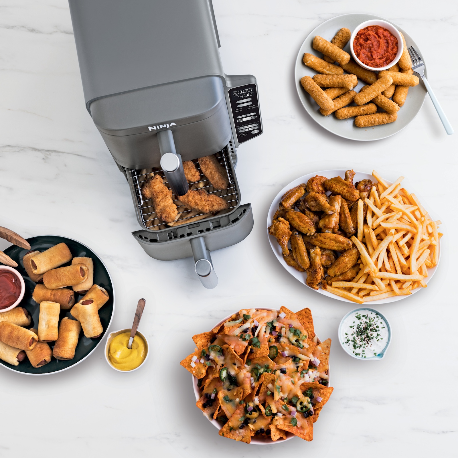 Diese Heißluftfritteuse mit zwei Schubladen eignet sich perfekt für große Familien und viele Gäste, denn in jede 4,75-Liter-Schublade passt ein ganzes 1,4 kg schweres Brathähnchen. Perfekt für Portionen für bis zu 8 Personen. Kochen Sie auf 4 Ebenen gleichzeitig für gleichmäßig knusprige Ergebnisse. Setzen Sie einfach die mitgelieferten Double Stack-Grillroste in jede Schublade ein, um die Kochfläche zu verdoppeln.