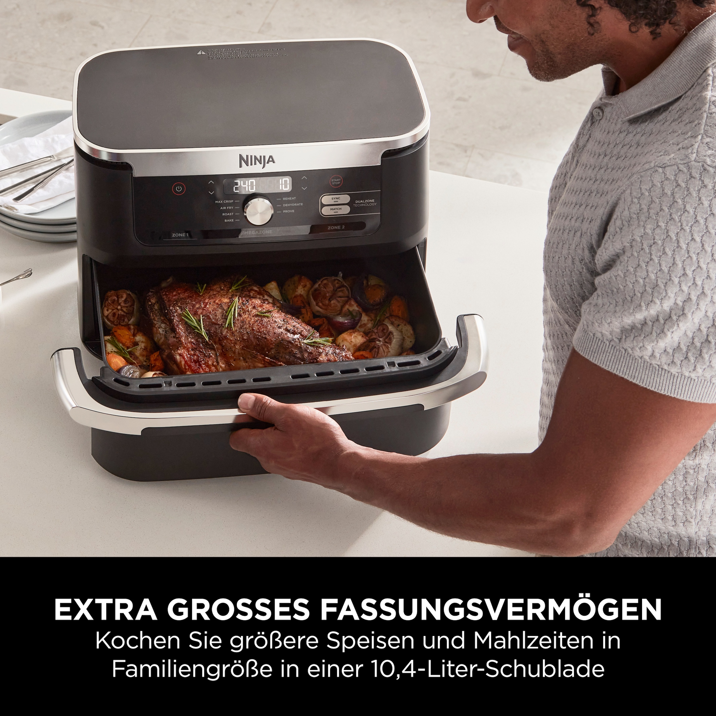 Es gibt viele Gründe, in einer Heißluftfritteuse zu kochen, vom gesünderen Frittieren bis zum geringeren Energieverbrauch als bei einem Backofen. Aber wenn Sie für viele Personen kochen, kann es manchmal schwierig sein, alles in einem Gerät unterzubringen. Mit der extragroßen MegaZone haben Sie jetzt viel Platz für größere Speisen, die Sie normalerweise im Backofen zubereiten würden. Von einem Brathähnchen mit knusprigen Kartoffeln bis hin zu einer vorbereiteten Lasagne in Familiengröße. Das Gerät ist groß genug für eine Brat- oder Auflaufform und ermöglicht die Zubereitung von Lachs und Süßkartoffeln, geröstetem Gemüse, eine große Portion Brownies und vielem mehr.