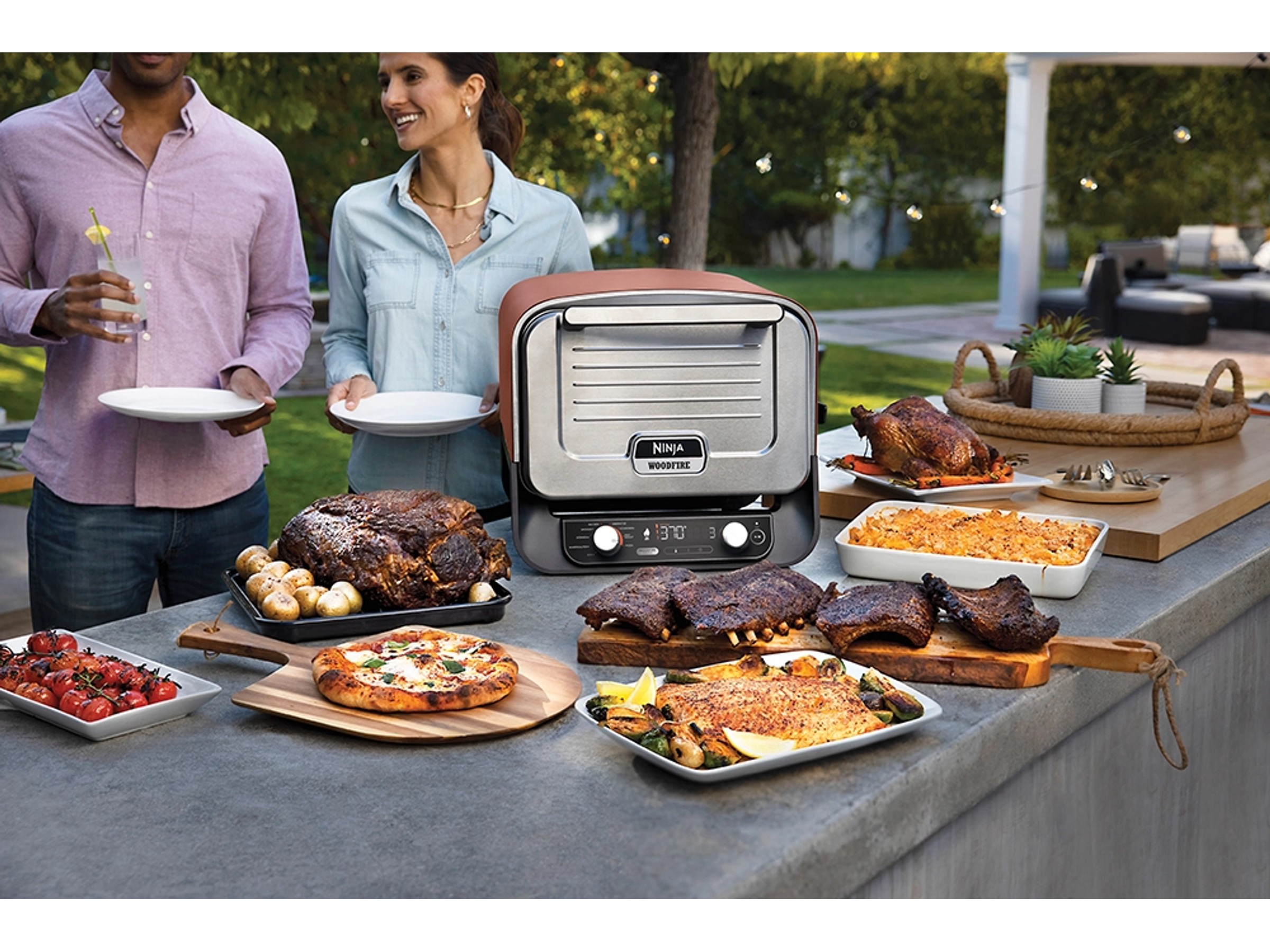 Mit dem Ninja Woodfire Outdoor Ofen, Pizzaofen & Smoker wird das Outdoor Cooking neu gedacht. Der elektrisch betriebene Ofen bietet 8-in-1-Vielseitigkeit mit einem weiten Temperaturbereich von 40-370 °C und bietet auf Knopfdruck eine Welt von Aromen, Texturen und Ergebnissen.