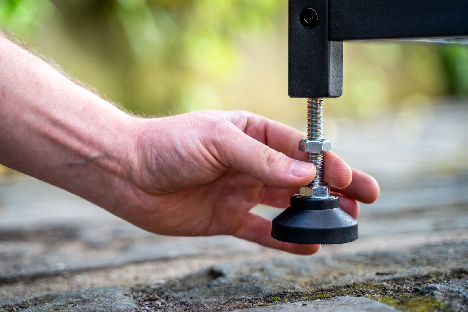 Erwecken Sie Ihre Outdoor-Küchenträume zum Leben. Schritt 1: Befestigen Sie das Fuß-Set für Ooni-Modultische. Wenn Sie den perfekten Platz zum Aufstellen Ihres Ooni-Tischs gefunden haben, schrauben Sie die mitgelieferten Rollen heraus und ersetzen Sie durch diese Gummifüße. Schritt 2: Jetzt können Sie fantastische Pizza backen!
