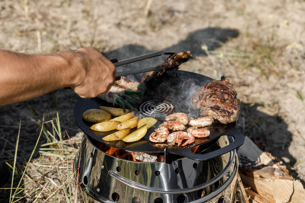 Während er in der Grillplatte auch dafür sorgt, dass Sie Grillgut sicher mittig auf der Platte platzieren können, dient er als Einsatz in dem Kochaufsatz als Mini-Grillrost und sichere Standfläche für Feuertöpfe und -pfannen. Durch den Einsatz für die Atago Plancha-Grillplatte entstehen bei Steak, Filet und Gemüse typische Grillstreifen, während auf der Plancha-Platte gleichzeitig Bratkartoffeln oder Spiegeleier braten. So können Sie eine krosse Beilage zubereiten und gleichzeitig Steak grillen, eine deftige Grillsauce oder eine Vorsuppe mit herzhaften Suppeneinlagen zubereiten. Darüber hinaus dient der Einsatz als sicherer Standort für Kochutensilien, während Sie weiter auf der Plancha-Platte grillen.