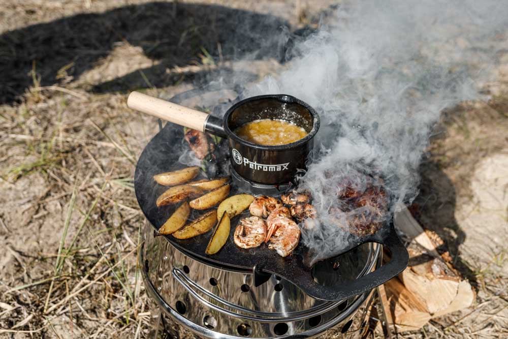 Der Petromax Kochaufsatz für die Atago Grillplatte ist die flexible Ergänzung für das Grillen auf der Plancha-Platte. Der Kochaufsatz fügt sich genau in die Aussparung der Grillplatte ein und sorgt dafür, dass das Grillgut sicher auf der Platte bleibt. Darüber hinaus dient der Aufsatz für direkten Flammenkontakt zur Zubereitung von Saucen, Suppen, Pfannengerichten oder Kaffee, während Ihre stärkende Mahlzeit auf der Atago Grillplatte brutzelt. So haben Sie mit einem kleinen Feuertopf, Saucentopf oder einer Kasserolle die Möglichkeit, eine Grillsauce, eine deftige Vorsuppe oder eine würzige Beilage zuzubereiten. Anschließend können Sie mit dem Perkolator einen aromatischen Kaffee kochen oder mit der kleinen Teekanne einen Wildkräutertee.