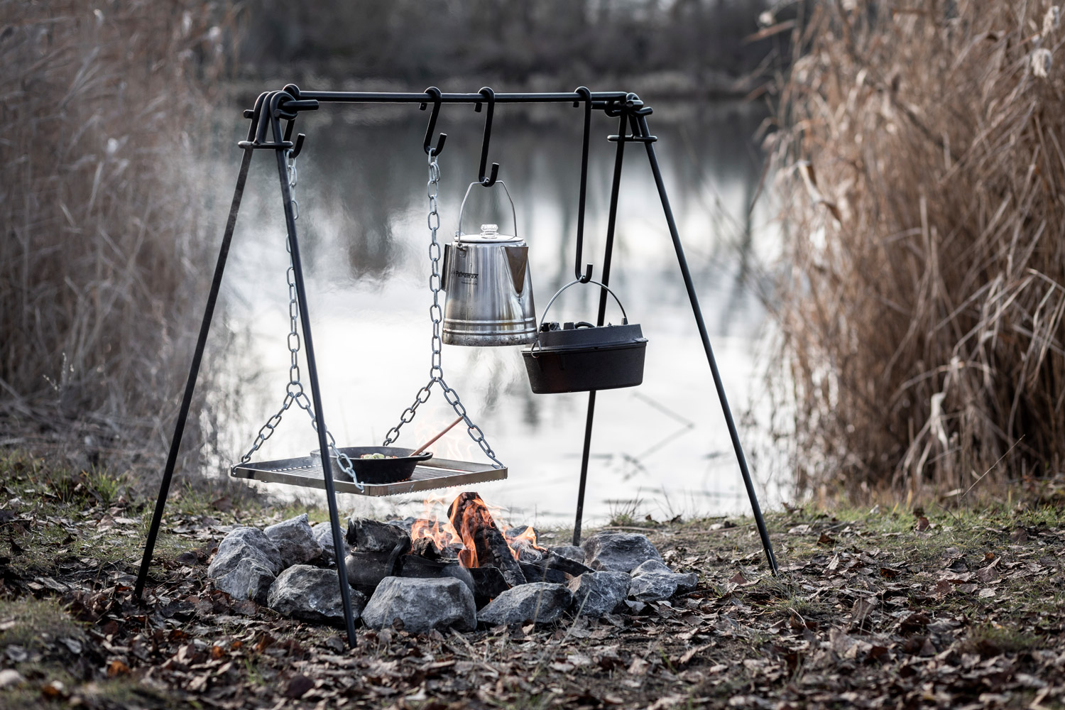 Die Feuerbrücke steht dank der Ösen-Konstruktion sicher auf vier Beinen und ist in Kürze einsatzbereit. Dank der 115 cm langen Querstange können Sie Ihre Camping-Küche über einer oder mehreren Feuerstellen aufbauen. Der Grillrost verfügt über eine in der Länge flexibel einstellbare Kettenaufhängung. Die umlaufende Umrandung hält das Grillgut sowie Pfannen und Co. sicher an ihrem Platz.
