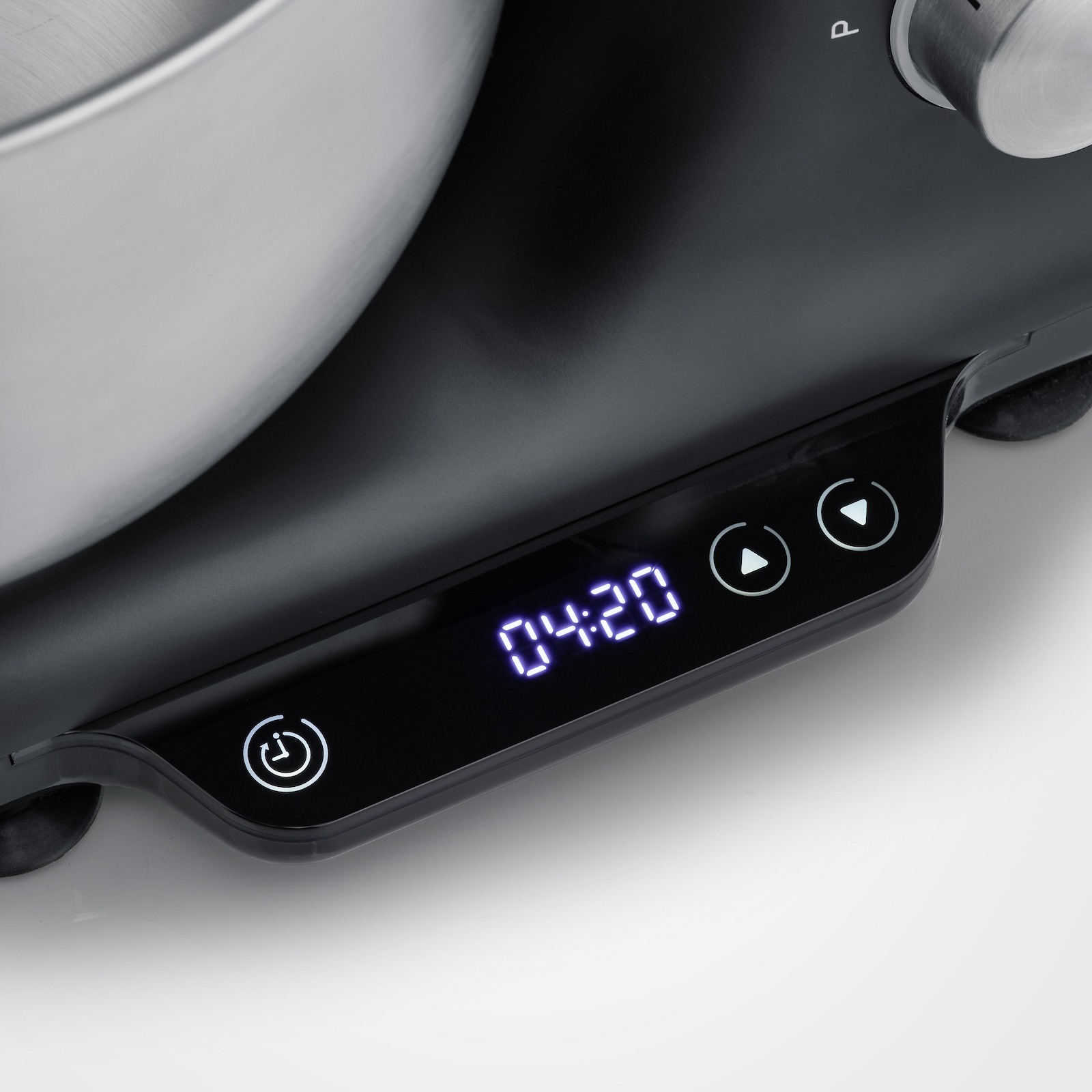 Der Allrounder mit ordentlich Power: 1.000 Watt bringen ordentlich Kraft mit, auch für schwierige Teige. Die Saugnäpfe unter der robusten Maschine sorgen dabei für einen sicheren Stand. Über 8 Leistungsstufen lässt sich die Leistung der Küchenmaschine flexibel regulieren. Zwei praktische Display-Modi erleichtern die Arbeit: Die Küchenmaschine stoppt nach der voreingestellten Zubereitungszeit oder zeigt die vergangene Zeit während der Zubereitung an. Die integrierte Waage mit Digitalanzeige zeigt Ihnen an, wieviel Masse Sie der Schüssel hinzufügen. So sparen Sie sich das Abwiegen in separaten Schüsseln. Weniger zu spülen, einfach praktisch zu handhaben.