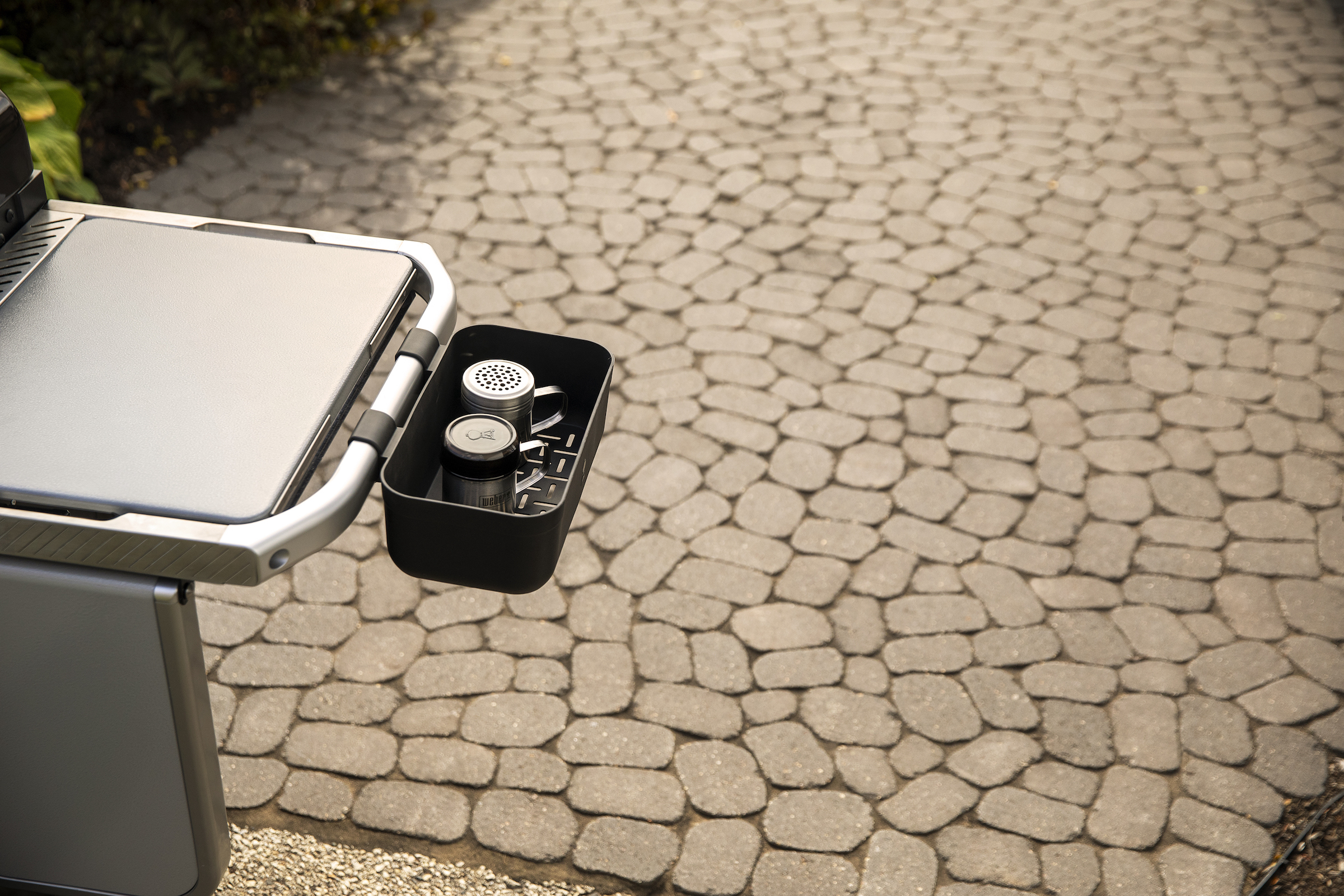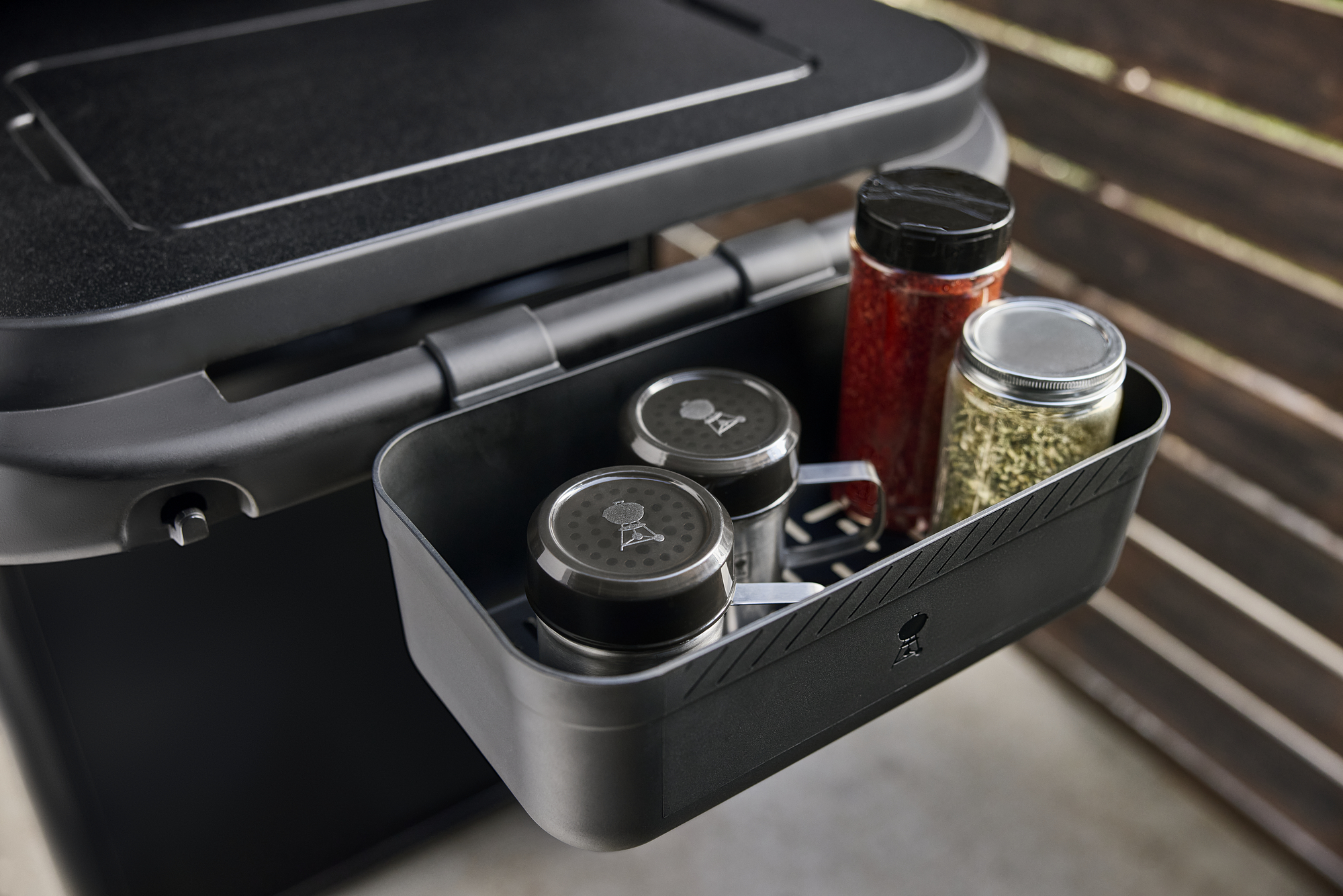 Der Weber Works Saucen- und Gewürzhalter ist Teil des Weber Works Zubereitungs-, Grill- und Aufbewahrungssystems, das jetzt für den Weber SLATE 76 cm Premium Plancha-Grill und den klappbaren Grilltisch erhältlich ist.
